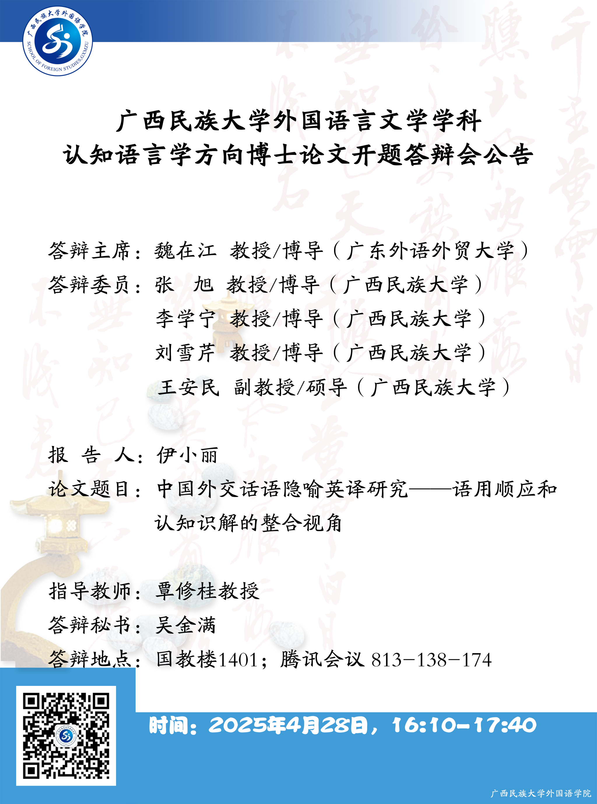外国语言文学学科认知语言学方向博士论文开题答辩公告