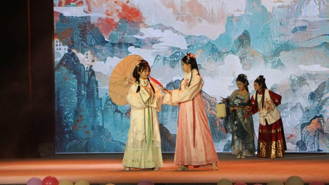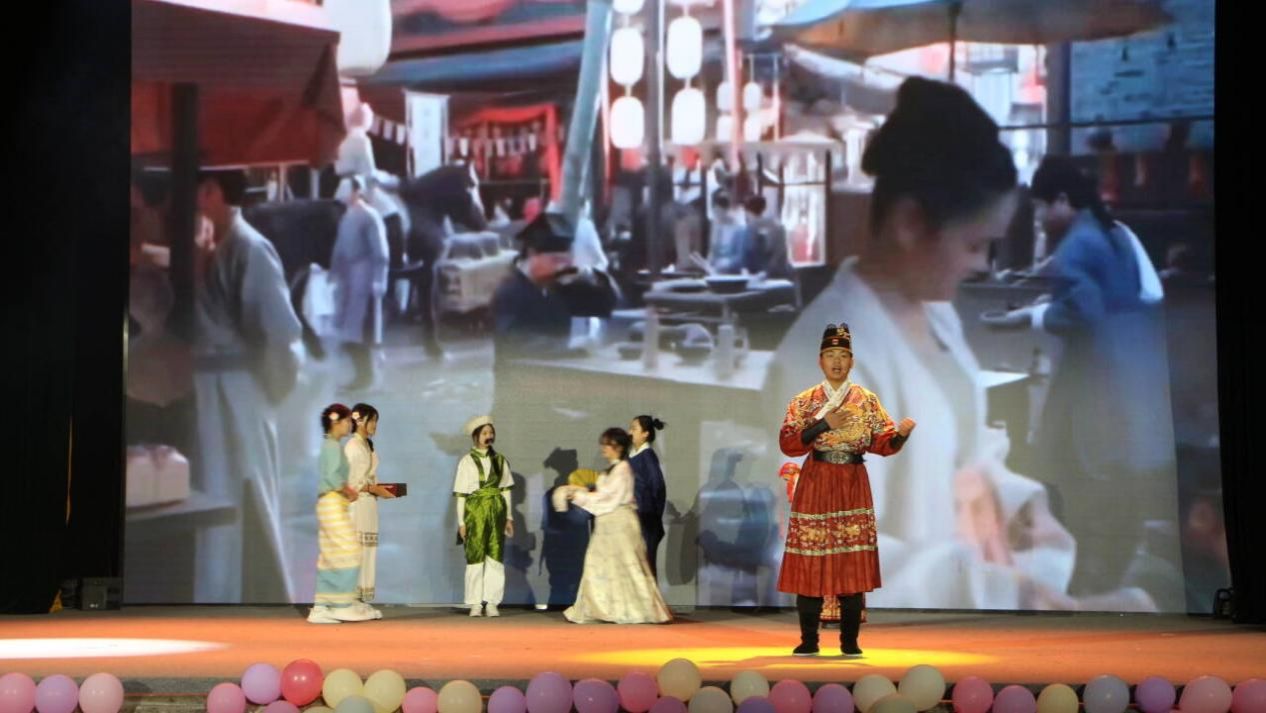 晚会在一曲《锦绣大中华》开场舞中拉开序幕。第一篇章“中外融通,走向世界”精彩纷呈,法语歌曲串烧以其纯净的旋律传递了对世界的纯真、爱与和平的美好愿景,英语趣配音展现了文化的共鸣与交融。《音乐奇遇记》以欢快的节奏鼓励追梦勇气,情景剧《遇见·郑和下西洋》再现历史辉煌,引领文化探索,传递了和平发展与构建人类命运共同体的深刻主题。