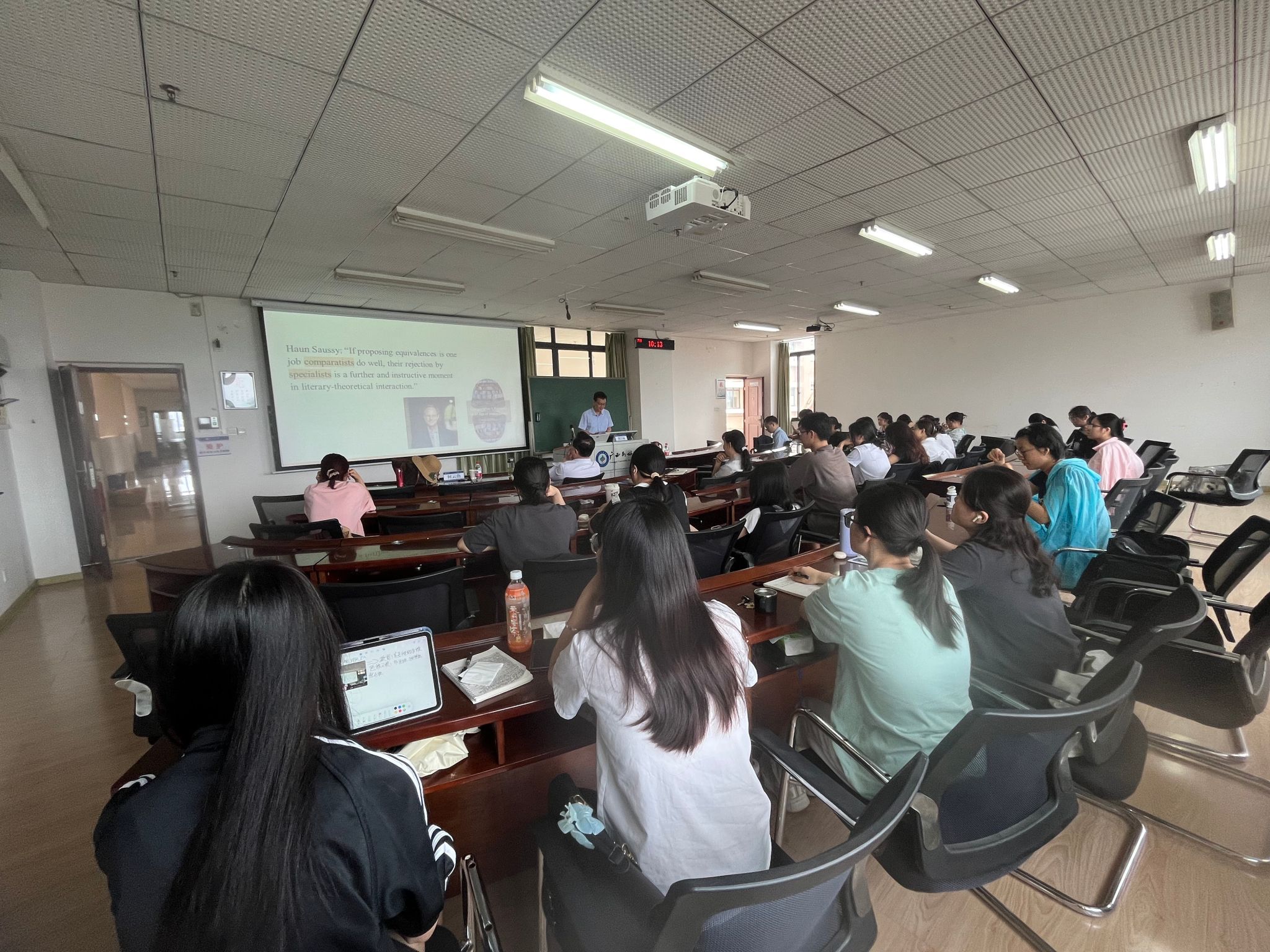 龚浩敏老师以李达三教授(Prof. John Deeney,1931-2022)的学术贡献为切入点,回顾了比较文学“中国学派”在大中华地区的形成与发展历程。他围绕李达三教授提出的“composite literature”(复合文学)与“comparativist”(比较者)两个关键词,深入探讨了“中国学派”的核心理念及其对当代学术研究的启示,由此指出李达三教授从上世纪70年代起致力于推动比较文学的“第三条路线”,为中国比较文学研究奠定了重要基础。讲座后,师生积极提问,就“面对拿理论直接套文本的分析方法,我们应该怎么样在研究中保持科学性” “中西对比思维运用在中英翻译之中”等话题进行深入讨论。龚浩敏老师详细解答,并分享研究心得。