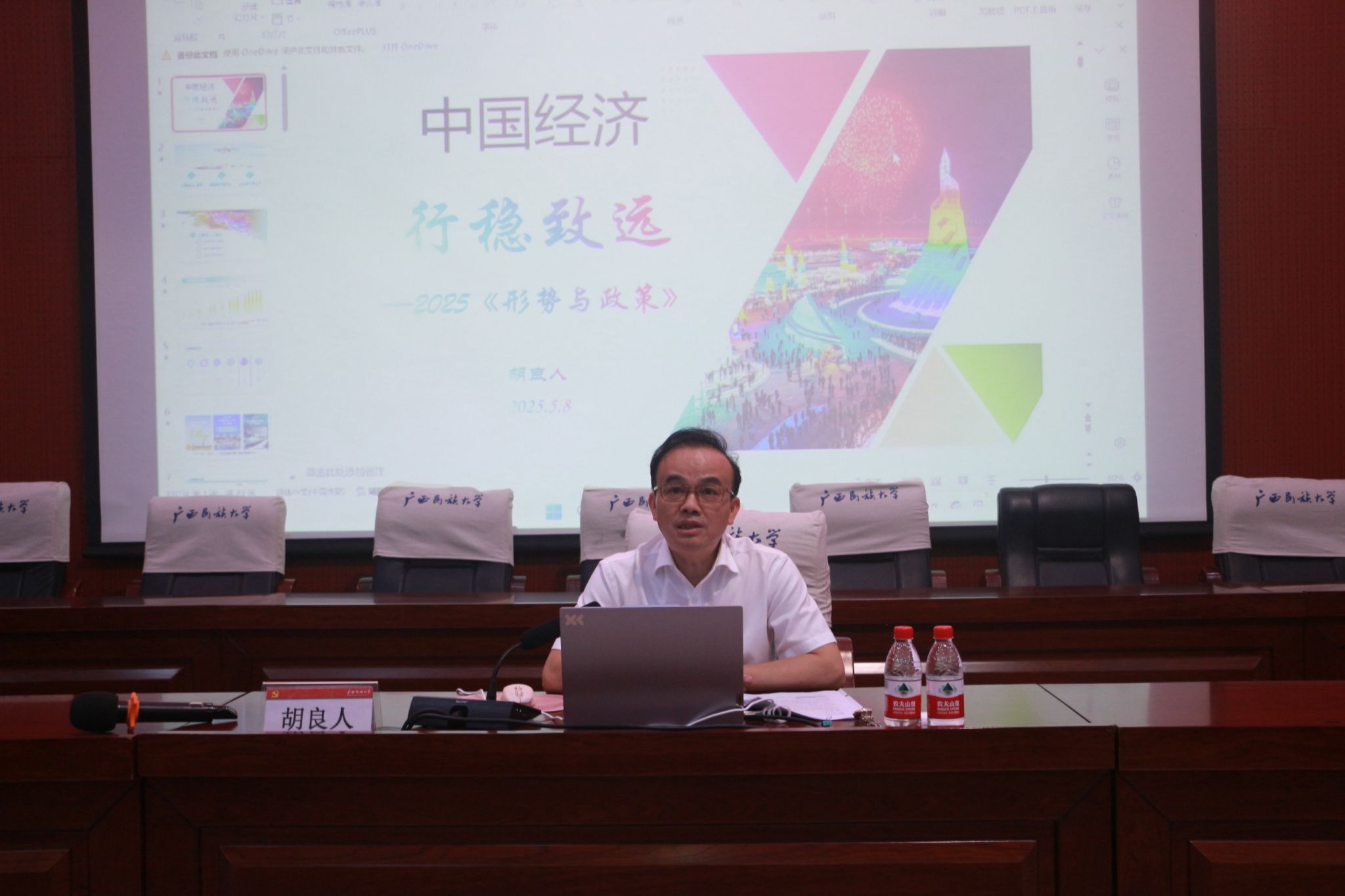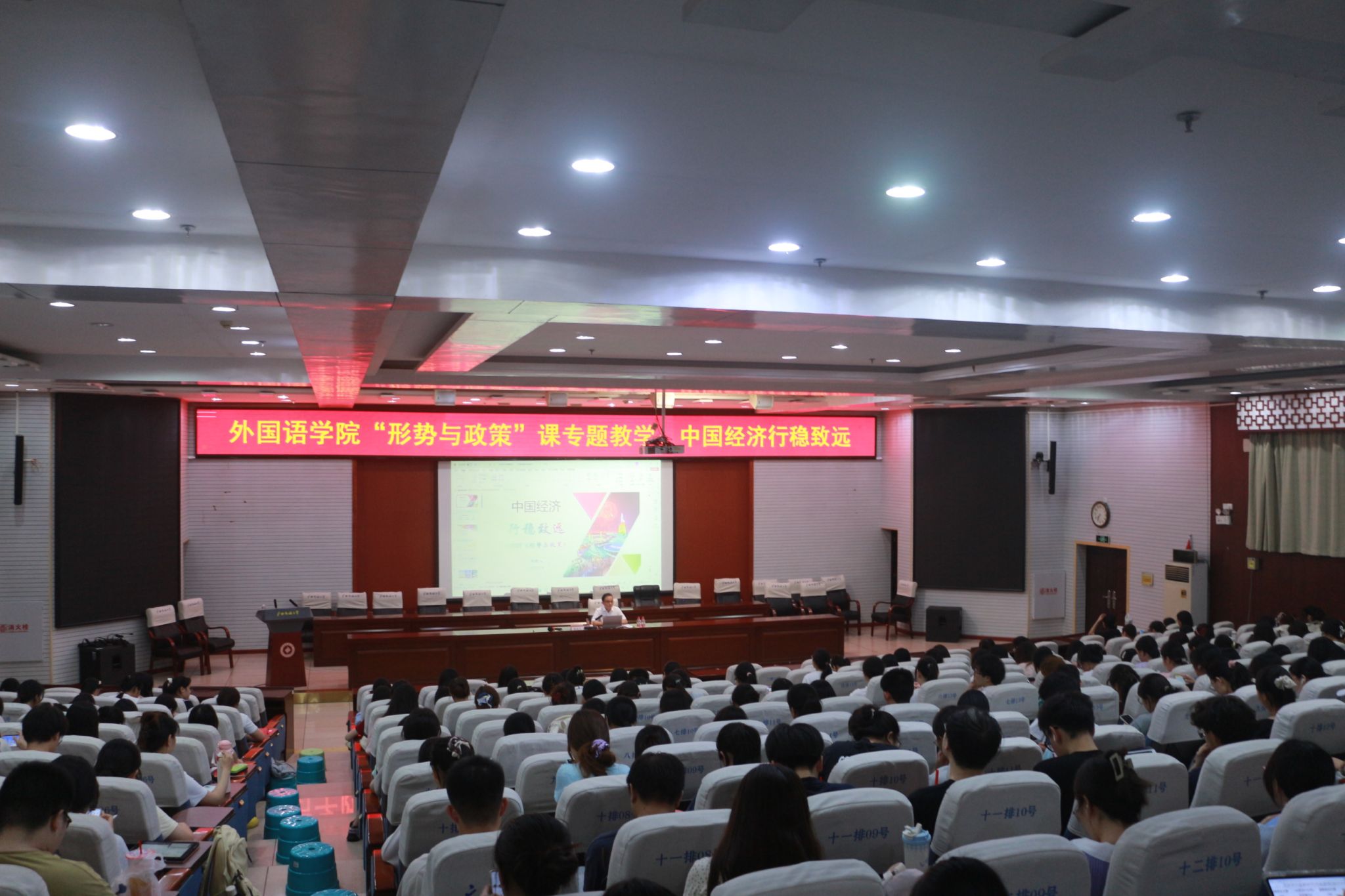 课堂上,胡良人书记围绕创新驱动、内需潜力、制度优势等核心要素展开分析,系统阐释新质生产力对经济高质量发展的推动作用,以及数字经济与实体经济深度融合带来的新机遇。针对外语专业特色,胡良人书记重点解析“外语专业如何服务中国经济高质量发展”“中国经济发展对国际合作的深远影响”等内容,着重强调外语专业员工在跨境贸易谈判、国际文化传播等领域的独特优势,鼓励青年学子密切关注国际经济形势,积极投身全球经济治理实践,为构建人类命运共同体贡献青春力量。