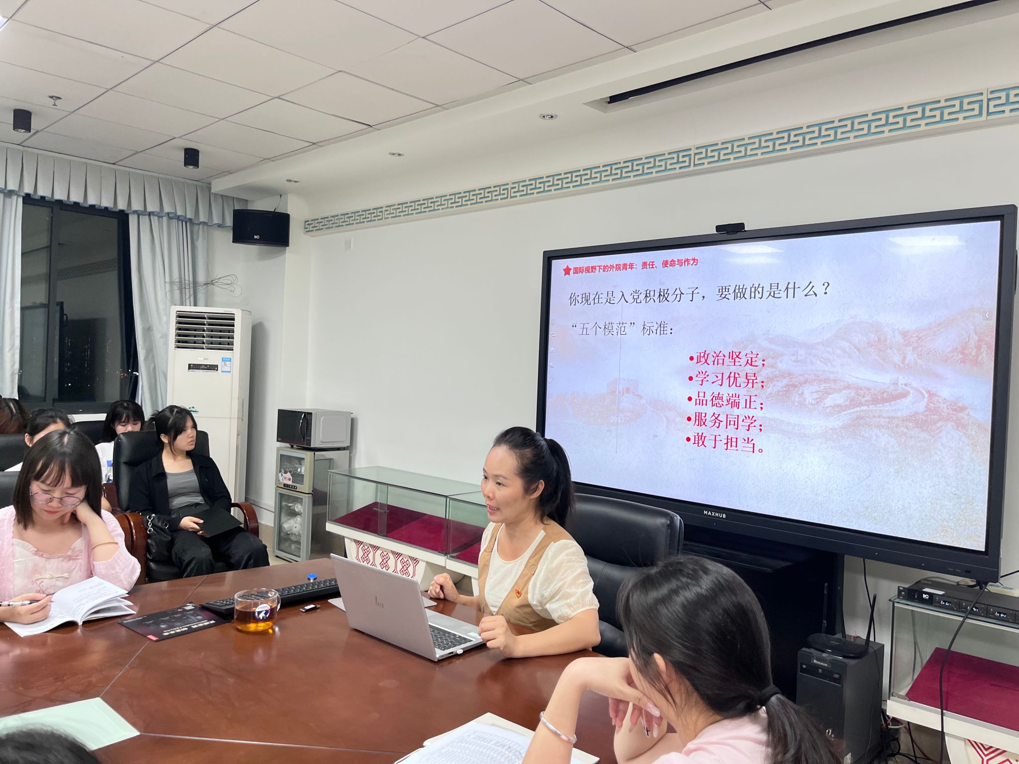 会上,覃慧敏副书记以“国际视野下的外院青年:责任、使命与担当”为题开展专题培训。她提出 “外院青年在国际视野下应该扮演什么角色” 这一议题,引导学员思考。接着,她结合外国语专业特点,深入阐释员工如何肩负时代责任与使命,呼吁积极分子发挥专业优势,讲好中国故事、传播好中国声音,积极展现可信、可爱、可敬的中国形象。同时,她强调积极分子要把坚定政治立场当作终身必修课,坚定理想信念,站稳人民立场。最后,她勉励同学们知行合一、主动作为,钻研专业知识,以语言为桥梁,搭建中外沟通纽带,做到学贯中西,砥砺前行。