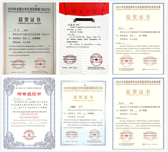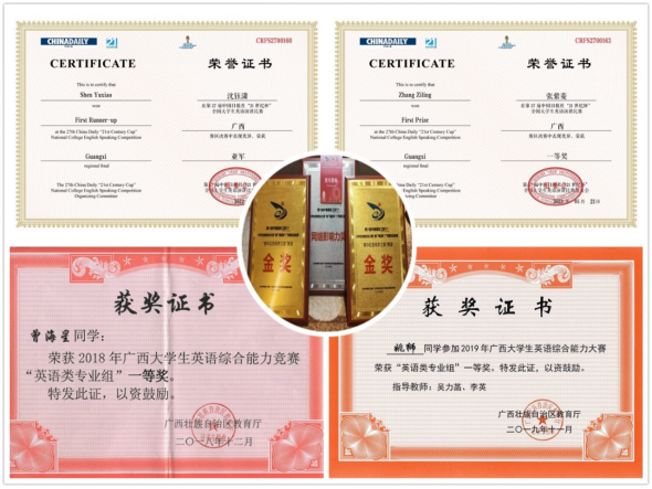 员工在各级各类专业竞赛中成绩优异,近五年共获省部级以上奖项70项。其中包括第三十届韩素音国际翻译大赛二等奖1项,第21届“外研社杯”全国英语辩论赛华南赛区三等奖1项,2019年“21世纪∙可口可乐杯”全国英语演讲比赛广西总决赛特等奖冠军1项,2022年“21世纪∙可口可乐杯”全国英语演讲比赛广西总决赛特等奖亚军1项,2019、2020、2021年全国老员工英语竞赛特等奖4项,2019年广西老员工综合英语能力大赛英语专业组一等奖1项,2018年广西老员工综合英语能力大赛英语专业组一等奖1项,第四届“互联网+”创新创业大赛广西赛区选拔赛铜奖1项。