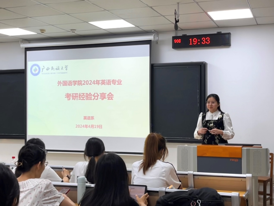 4月19日晚上,英语系在国际教育综合楼908召开考研经验分享会。会议由英语系副主任朱文宣老师和高琳老师共同主持,邀请了五位2020级的优秀考研员工代表——杭越、张紫菱、豆楠、梁欣澜和潘美君,与2021级和2022级的本科生分享考研经验。